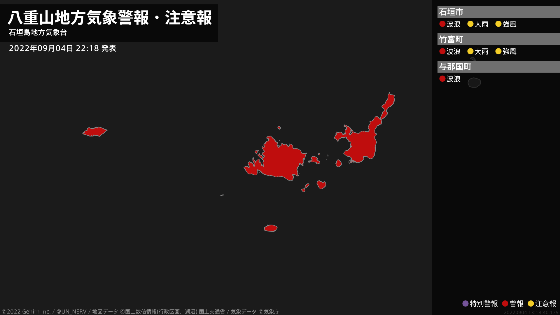 【八重山地方 気象警報・注意報 2022年09月04日 22:18】与那国島地方では5日明け方まで、石垣島地方では5日昼前まで、高波に警戒してください。#気象警報注意報 #八重山地方