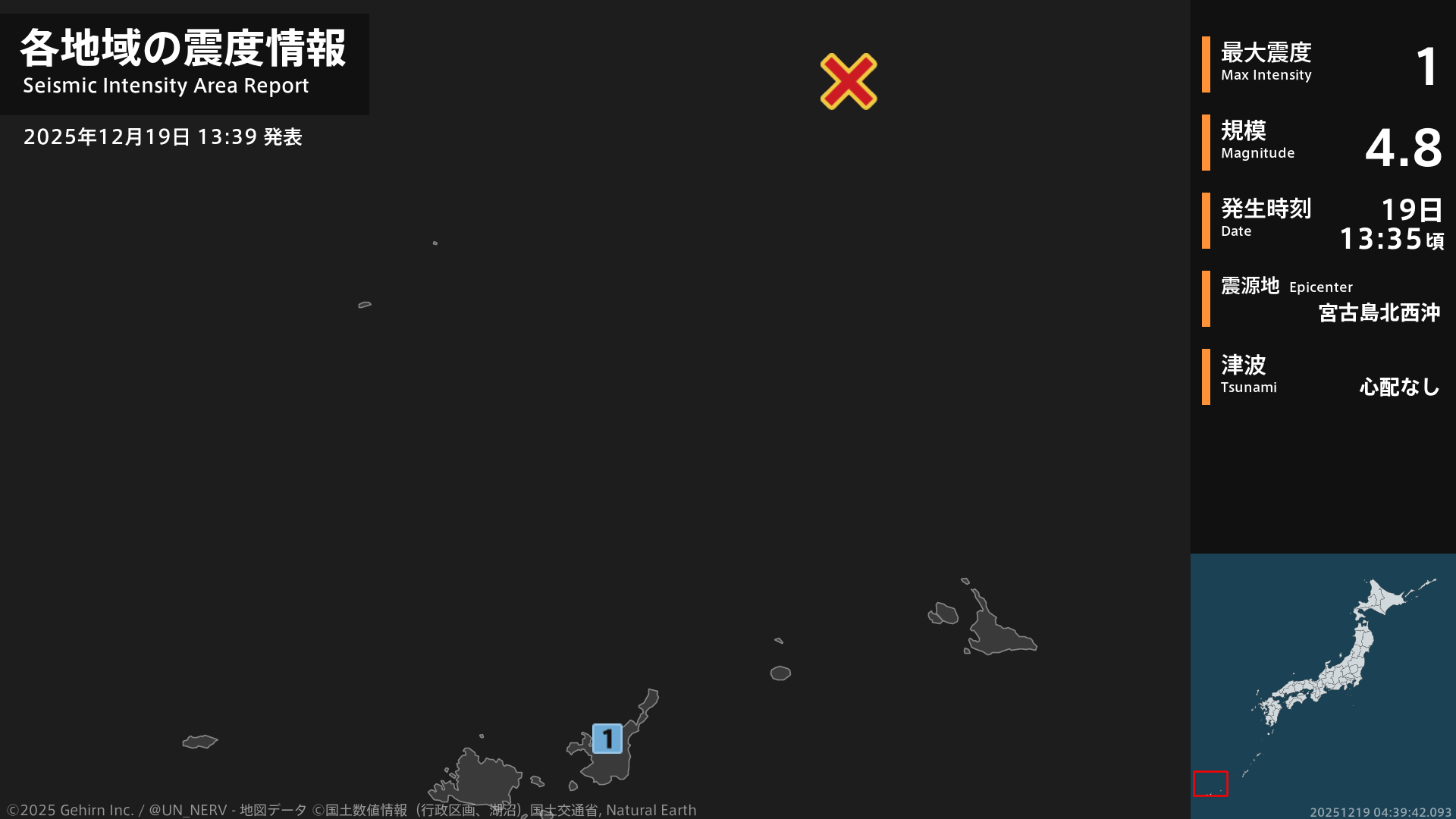 【地震情報 2025年12月19日】13時35分頃、宮古島北西沖を震源とする地震がありました。震源の深さは約160km、地震の規模はM4.8、最大震度1を沖縄県で観測しています。この地震による津波の心配はありません。#地震 #沖縄県