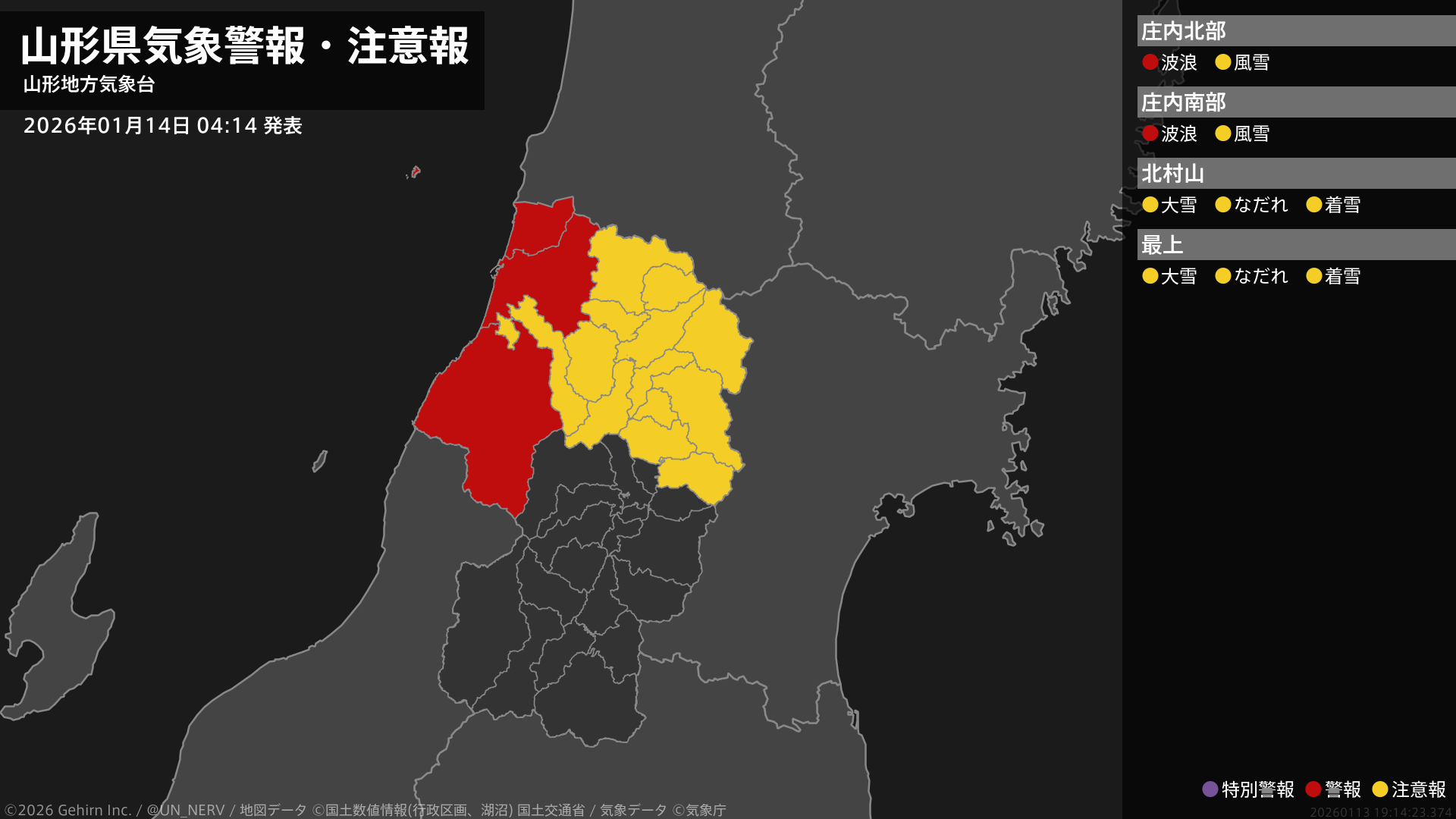 【山形県 気象警報・注意報 2026年01月14日 04:14】