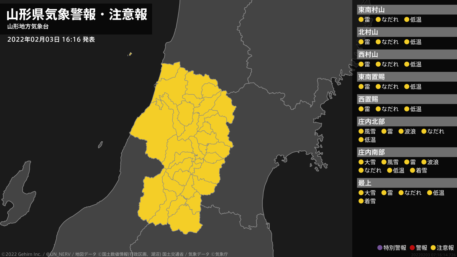 【山形県 気象警報・注意報 2022年02月03日 16:16】庄内では、風雪や高波に注意してください。庄内、最上では、大雪や電線等への着雪に注意してください。山形県では、落雷やなだれ、低温に注意してください。#気象警報注意報 #山形県