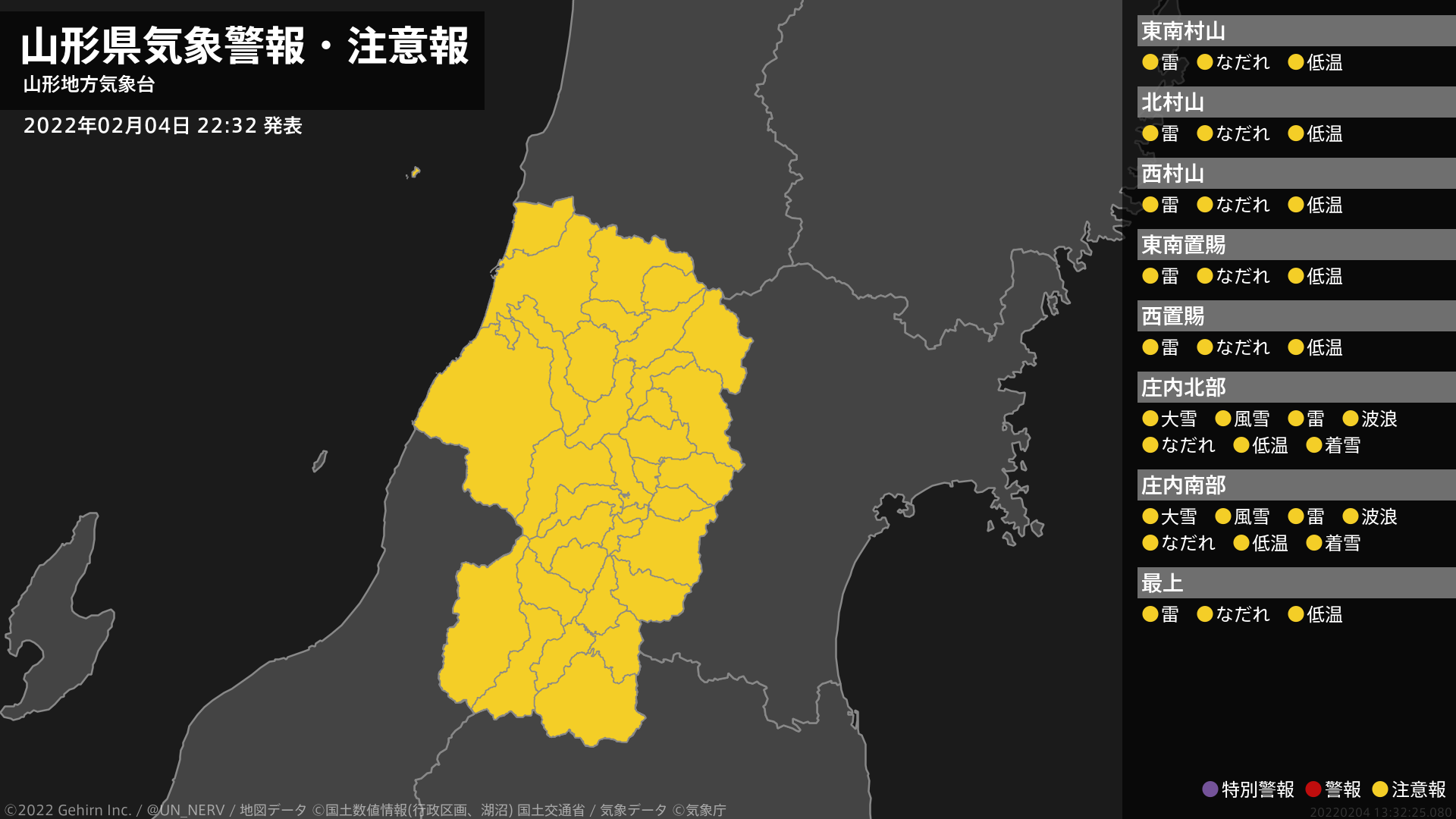 【山形県 気象警報・注意報 2022年02月04日 22:32】庄内では、風雪や大雪、高波、電線等への着雪に注意してください。山形県では、落雷やなだれ、低温に注意してください。#気象警報注意報 #山形県