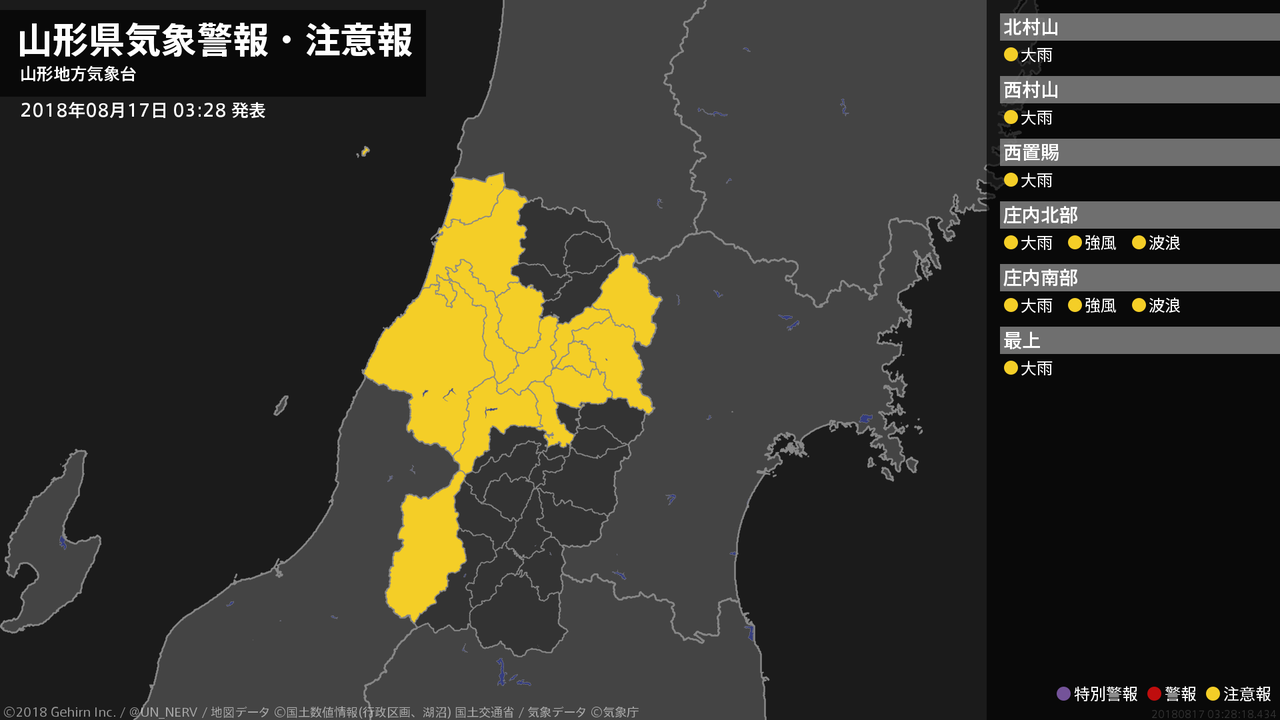 【山形県 気象警報・注意報 2018年08月17日 03:28】山形県では、17日昼前まで土砂災害に注意してください。庄内では、17日夕方まで強風に、17日夜遅くまで高波に注意してください。#気象警報注意報 #山形県