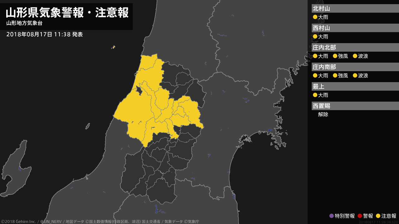 【山形県 気象警報(解除) 2018年08月16日 23:20】山形県に発表されていた気象警報はすべて解除されました。#気象警報 #山形県