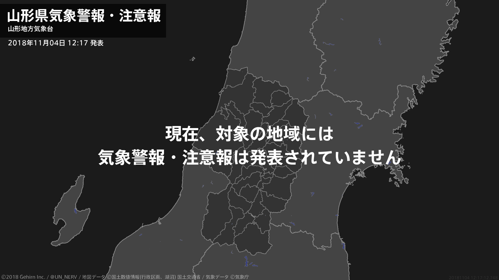 【山形県 気象警報・注意報 2018年11月04日 12:17】注意報を解除します。#気象警報注意報 #山形県