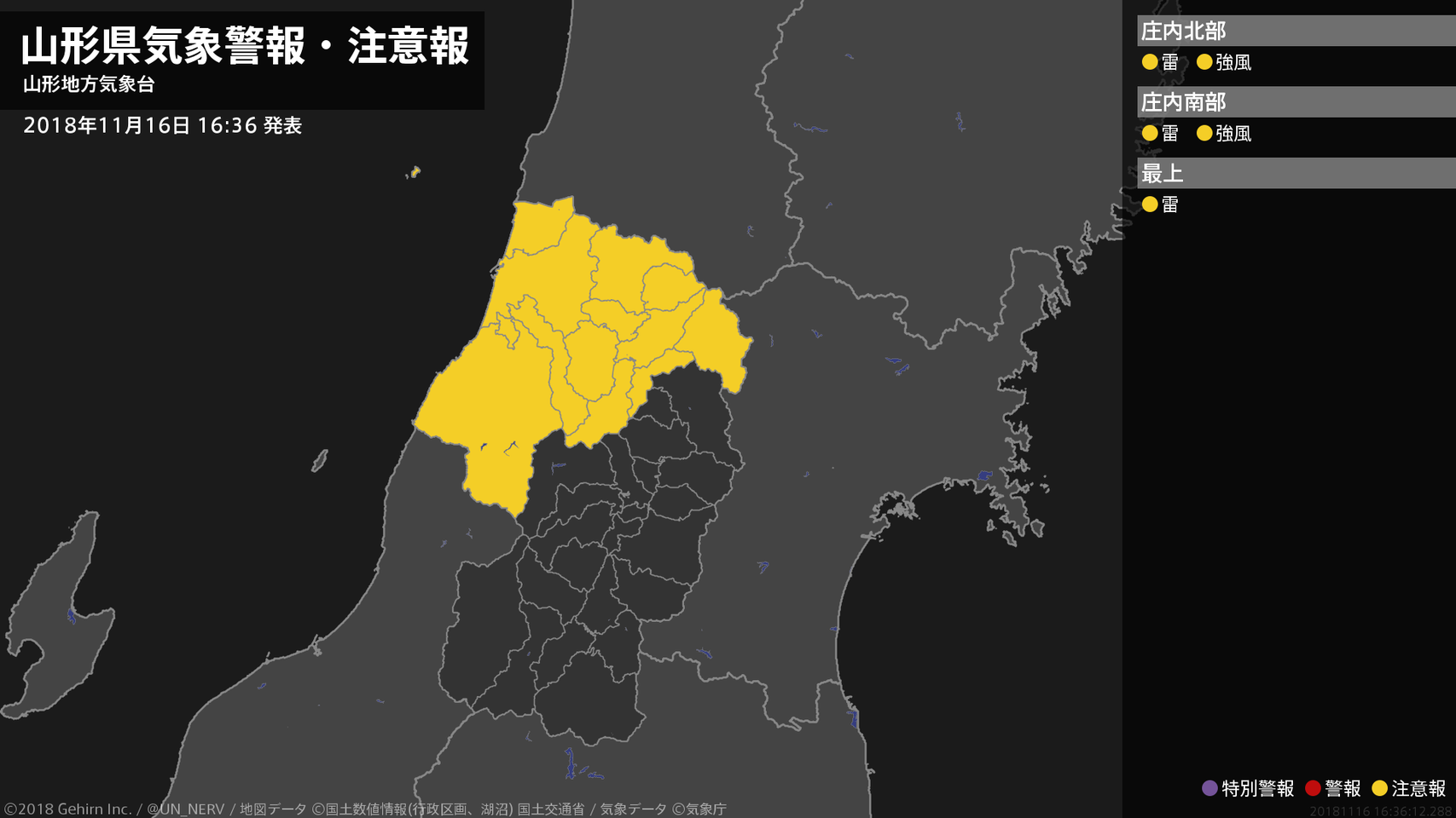 【山形県 気象警報・注意報 2018年11月16日 16:36】庄内では、17日未明から17日朝まで強風に注意してください。庄内では16日夜遅くから17日朝まで、最上では17日明け方から17日朝まで、急な強い雨や落雷に注意してください。#気象警報注意報 #山形県