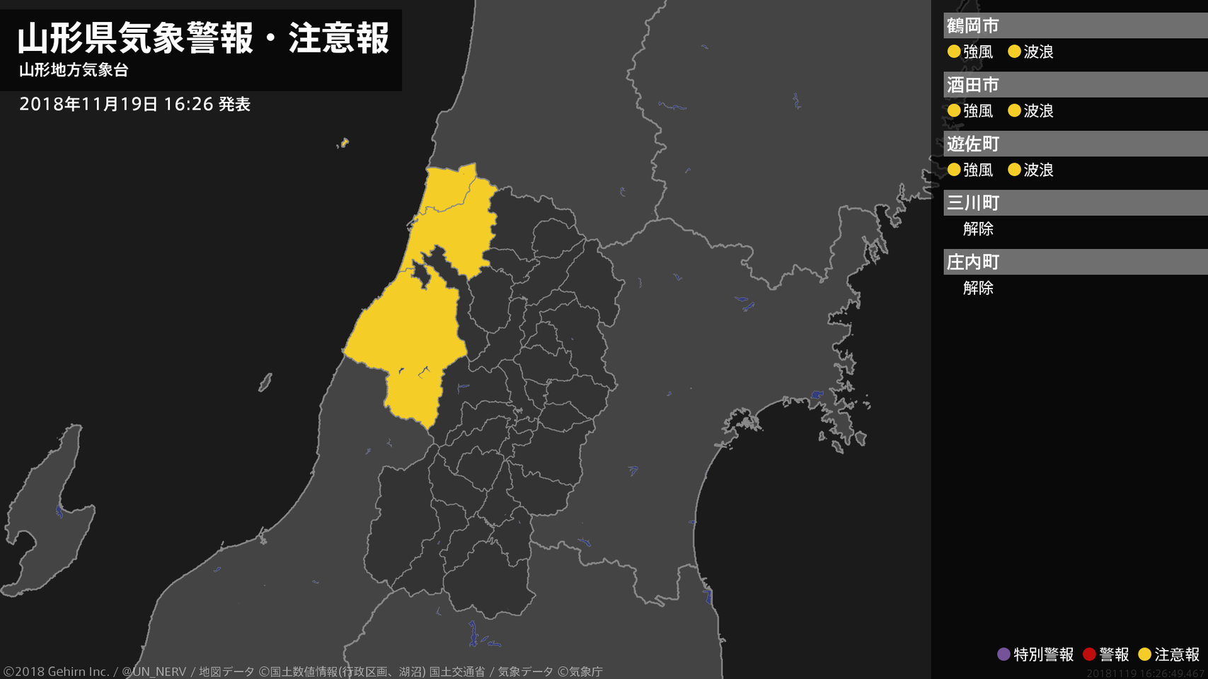 【山形県 気象警報・注意報 2018年11月19日 16:26】庄内では、19日夜のはじめ頃まで強風や高波に注意してください。#気象警報注意報 #山形県