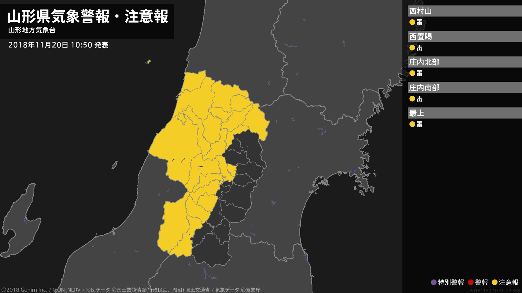 【山形県 気象警報・注意報 2018年11月20日 21:04】庄内では、強風や急な強い雨、落雷に注意してください。村山、置賜、最上では、濃霧による視程障害に注意してください。#気象警報注意報 #山形県