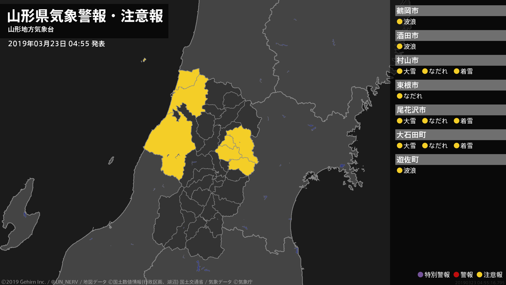 【山形県 気象警報・注意報 2019年03月22日 04:36】庄内では、22日夜遅くまで強風に、23日明け方まで高波に注意してください。山形県では、22日までなだれに注意してください。#気象警報注意報 #山形県
