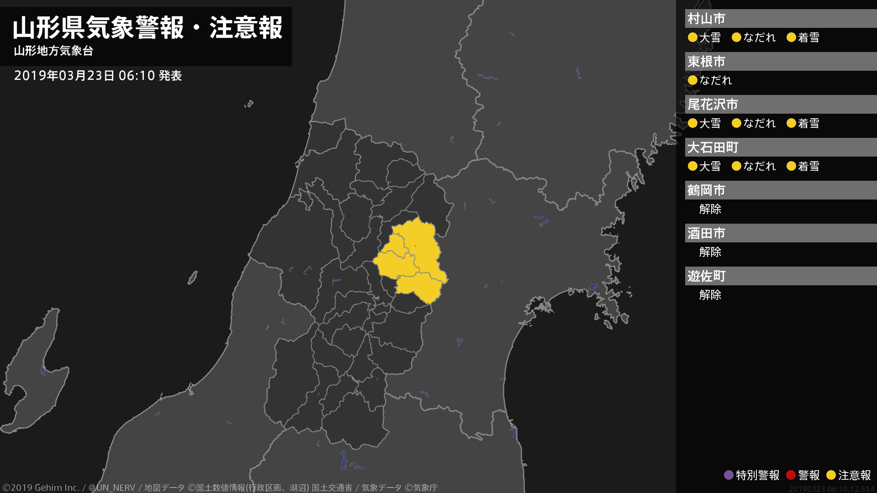 【山形県 気象警報・注意報 2019年03月23日 16:28】注意報を解除します。#気象警報注意報 #山形県