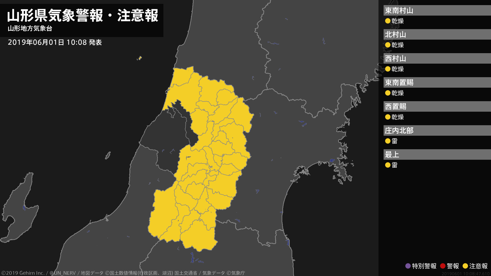 【山形県 気象警報・注意報 2019年06月01日 10:08】庄内、最上では、1日昼過ぎまで急な強い雨や落雷に注意してください。村山、置賜では、3日まで空気の乾燥による火の取り扱いに注意してください。#気象警報注意報 #山形県