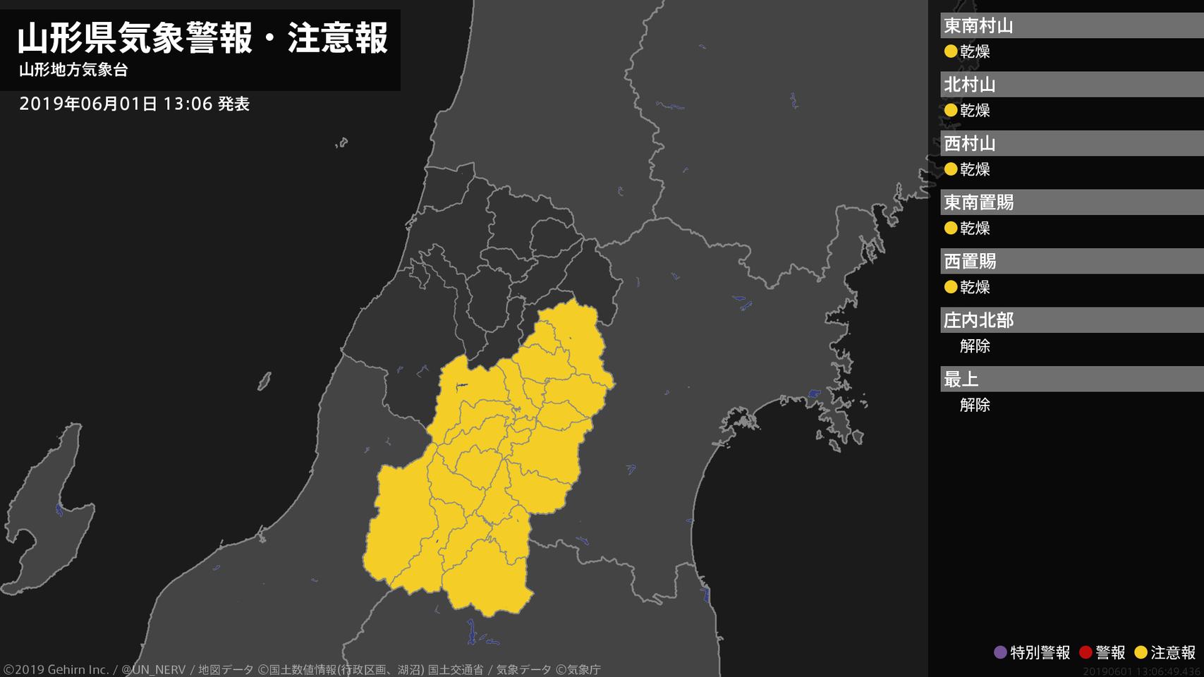 【山形県 気象警報・注意報 2019年05月31日 13:26】注意報を解除します。#気象警報注意報 #山形県