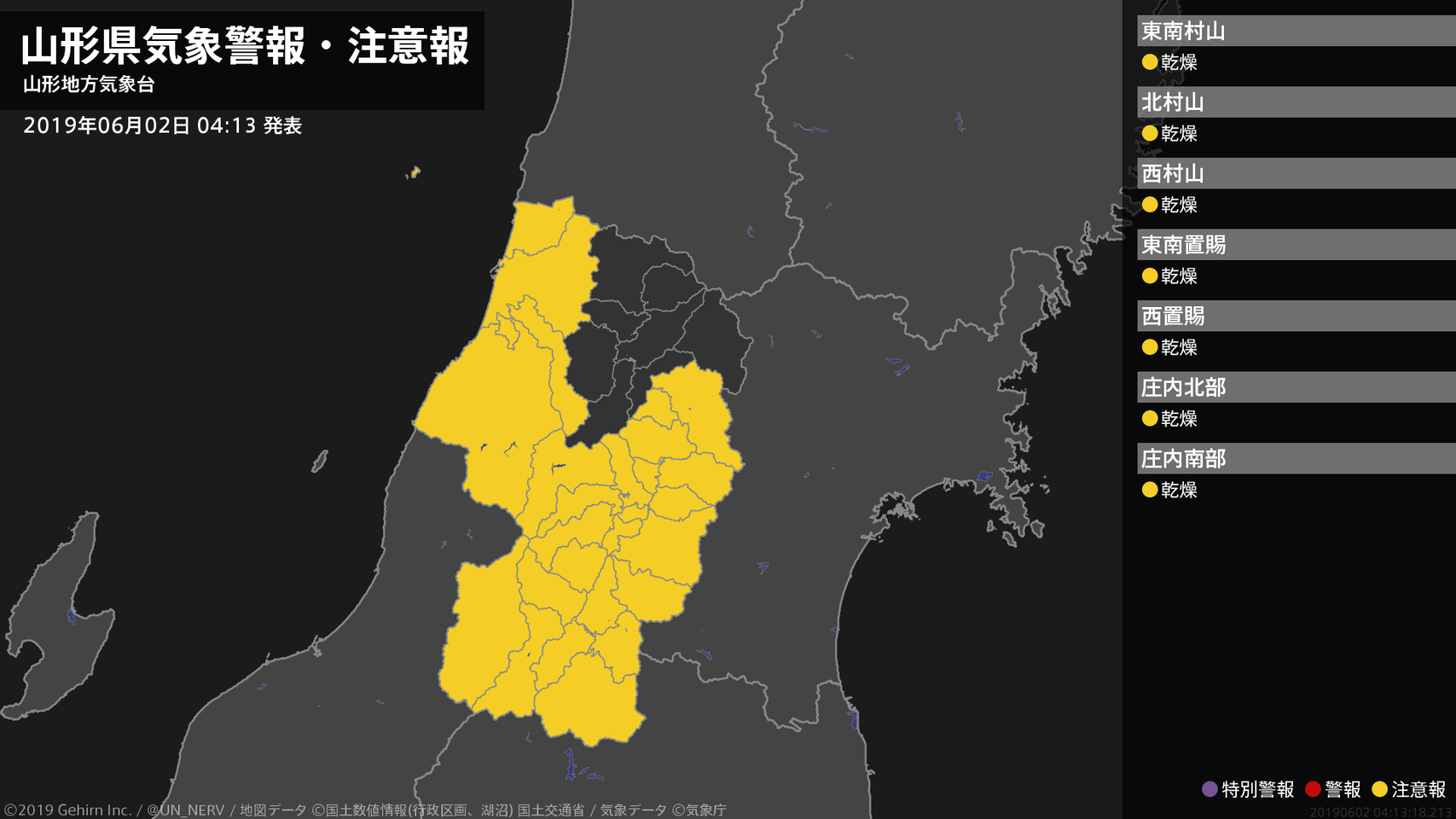 【山形県 気象警報・注意報 2019年06月02日 04:13】村山、置賜、庄内では、3日まで空気の乾燥による火の取り扱いに注意してください。#気象警報注意報 #山形県