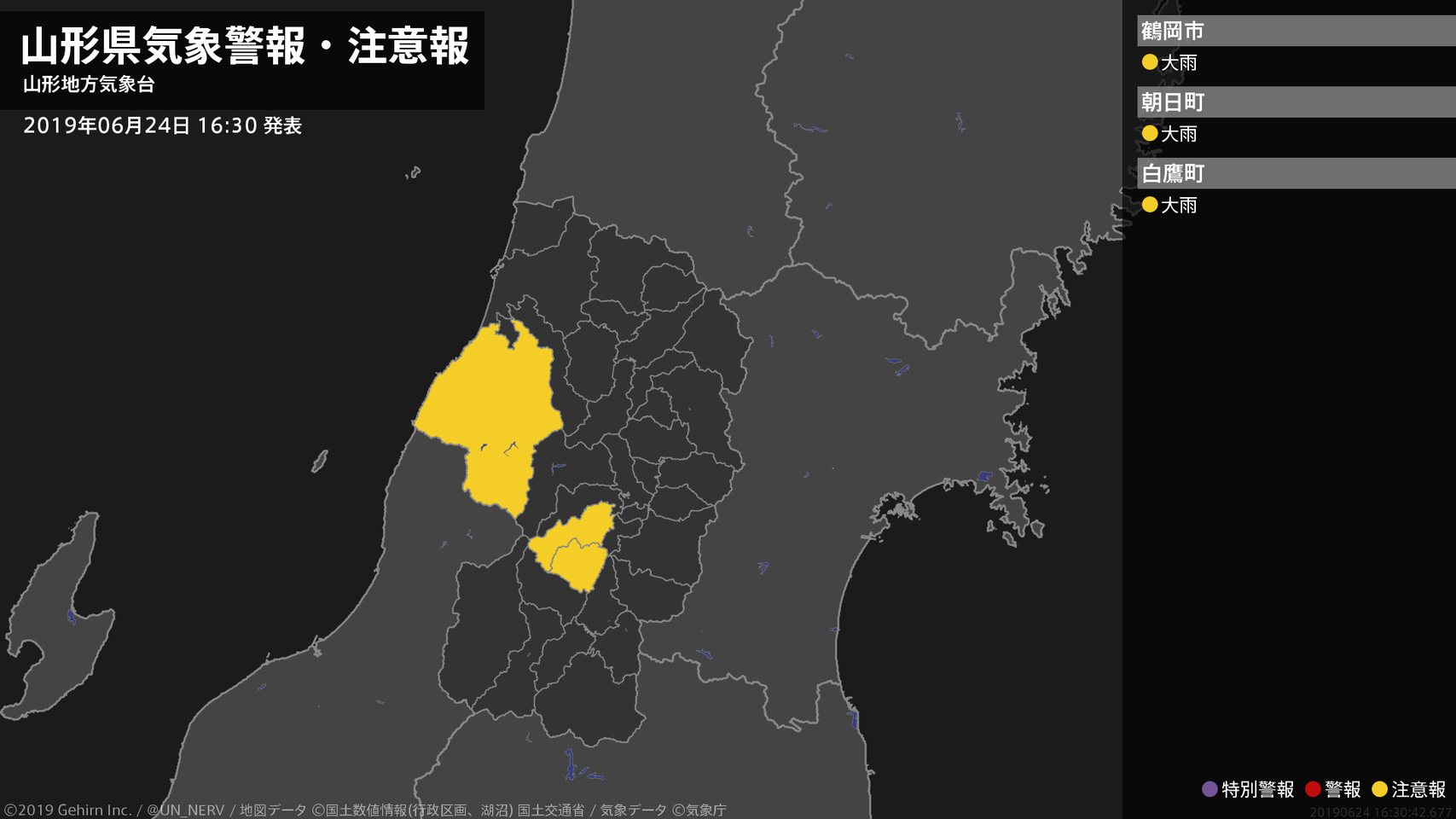 【山形県 気象警報・注意報 2019年06月24日 16:30】村山、置賜、庄内では、25日明け方まで土砂災害に注意してください。#気象警報注意報 #山形県