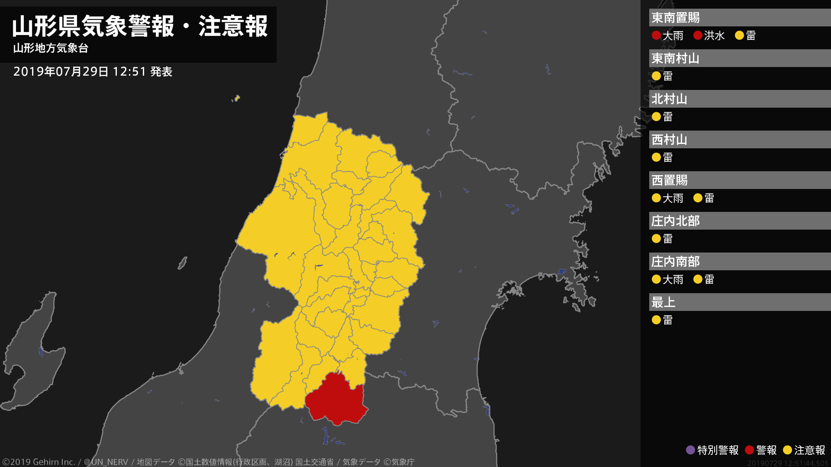 【山形県 気象警報・注意報 2019年07月29日 19:12】置賜では、30日未明まで土砂災害に注意してください。#気象警報注意報 #山形県