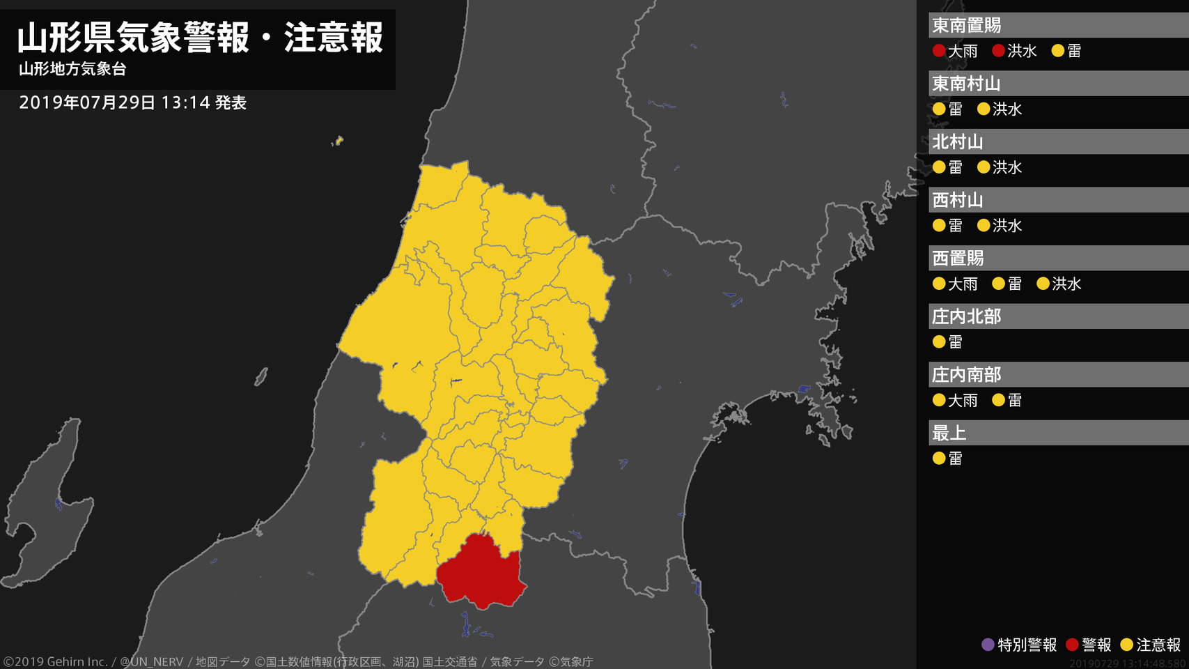 【山形県 気象警報・注意報 2019年07月29日 13:14】置賜では、29日夕方まで低い土地の浸水や河川の増水に警戒してください。#気象警報注意報 #山形県