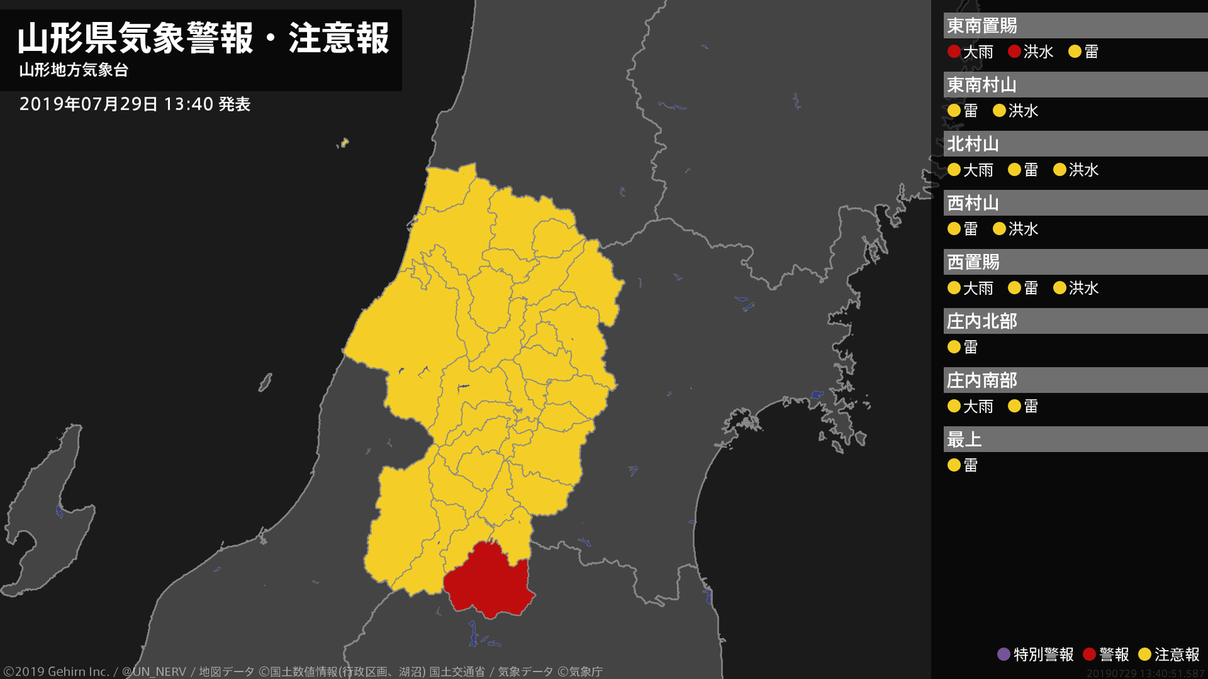 【山形県 気象警報・注意報 2019年07月29日 13:40】置賜では、29日夕方まで低い土地の浸水や河川の増水に警戒してください。#気象警報注意報 #山形県