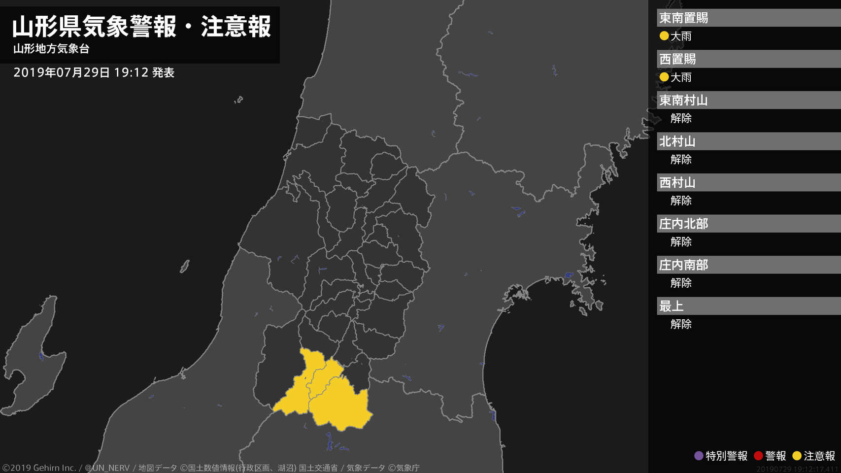 【山形県 気象警報(解除) 2019年07月29日 16:54】山形県に発表されていた気象警報はすべて解除されました。#気象警報 #山形県