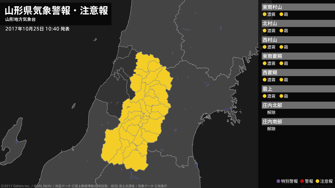 【山形県 気象警報・注意報 2017年10月25日 07:40】山形県では、25日昼前まで濃霧による視程障害に注意してください。#気象警報注意報 #山形県