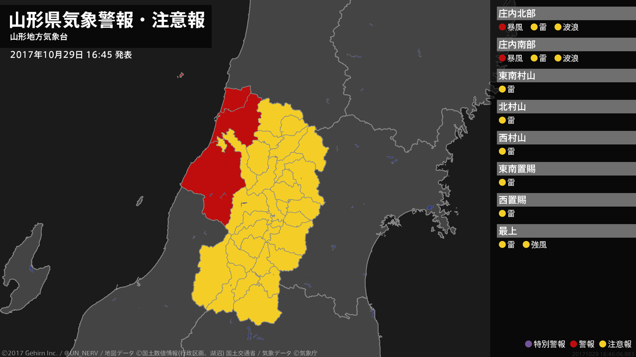 【山形県 気象警報 2017年10月29日 16:46】庄内では、29日夜遅くから30日昼前まで暴風に警戒してください。#気象警報 #気象警報注意報 #山形県