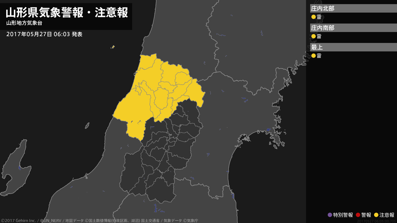 【山形県 気象警報・注意報 2017年05月27日 06:05】庄内、最上では、27日昼前まで急な強い雨や落雷に注意してください。#気象警報注意報 #山形県