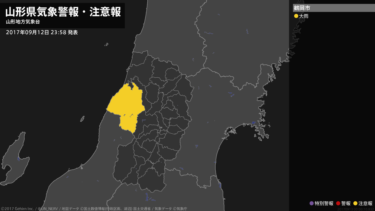 【山形県 気象警報・注意報 2017年09月13日 00:00】