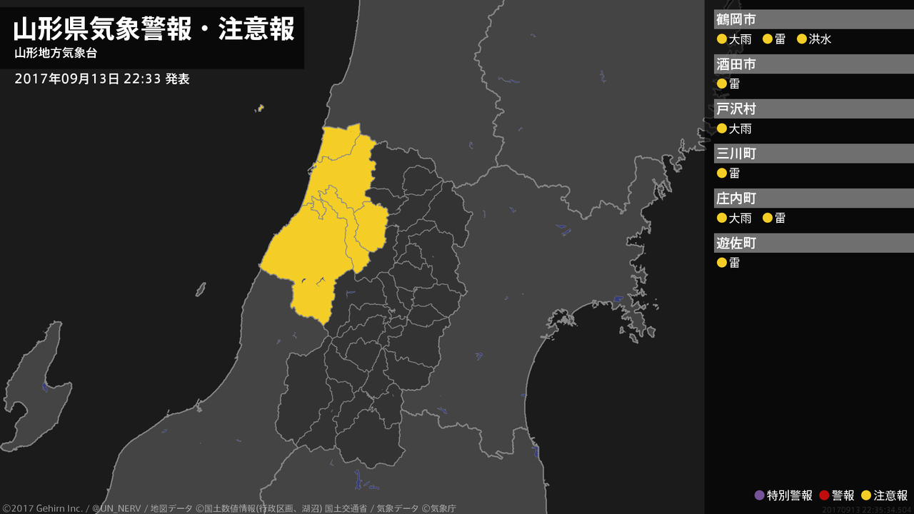 【山形県 気象警報・注意報 2017年09月13日 22:35】