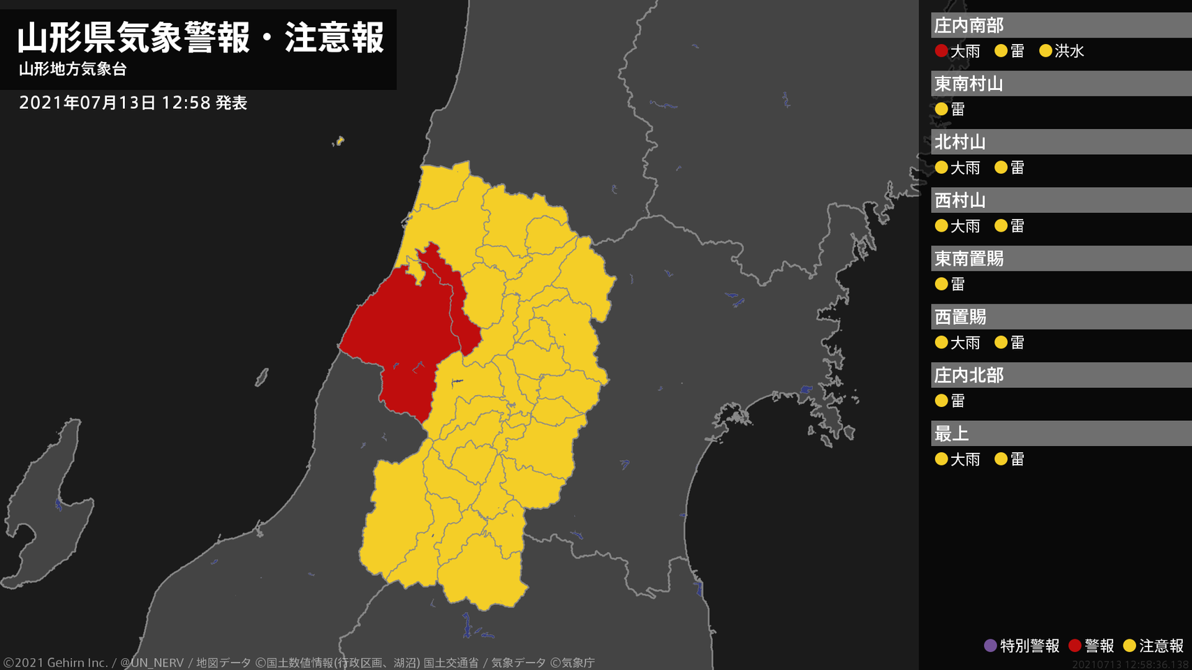 【山形県 気象警報・注意報 2021年07月13日 11:43】