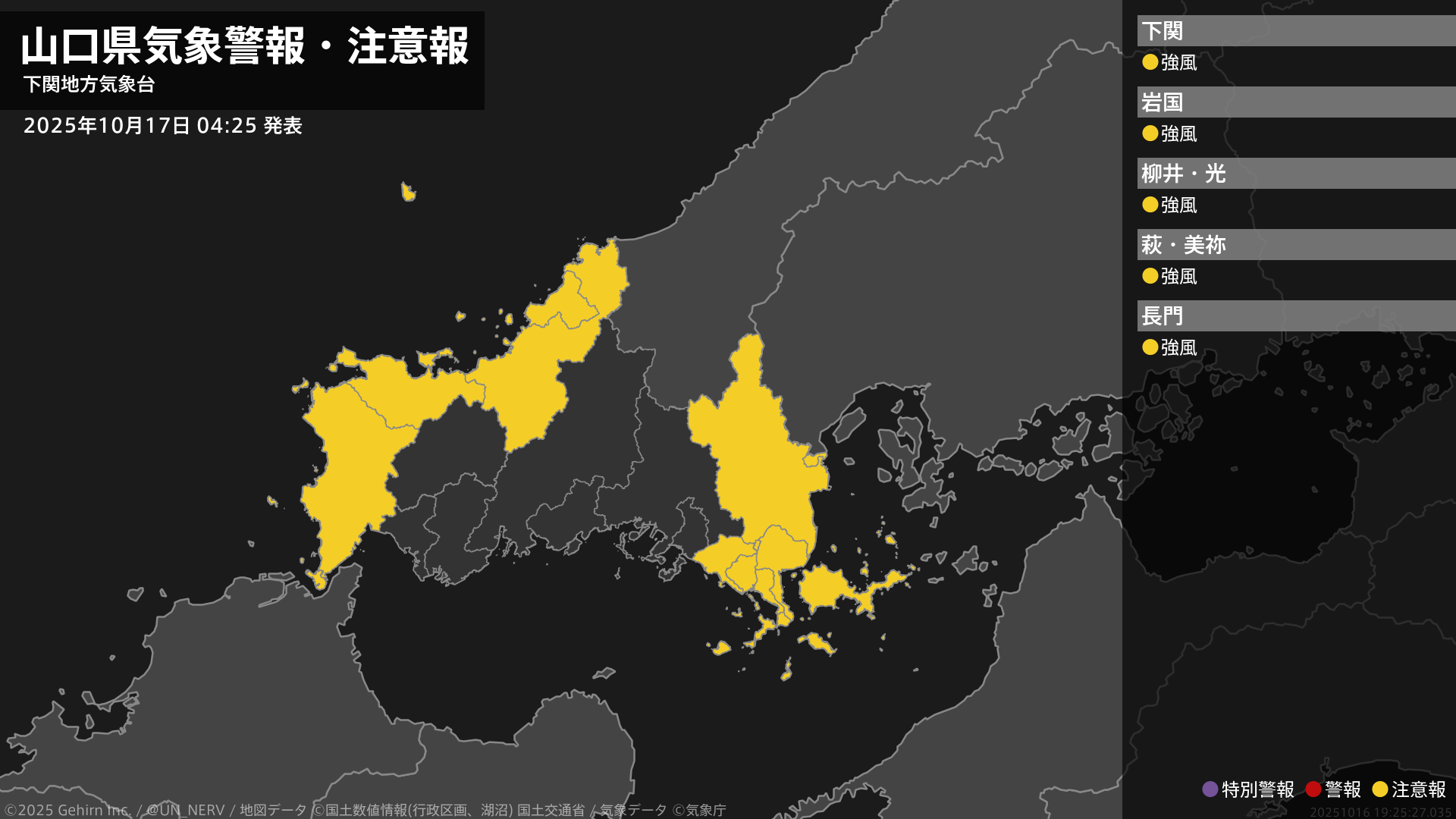 【山口県 気象警報・注意報 2025年10月17日 04:25】
