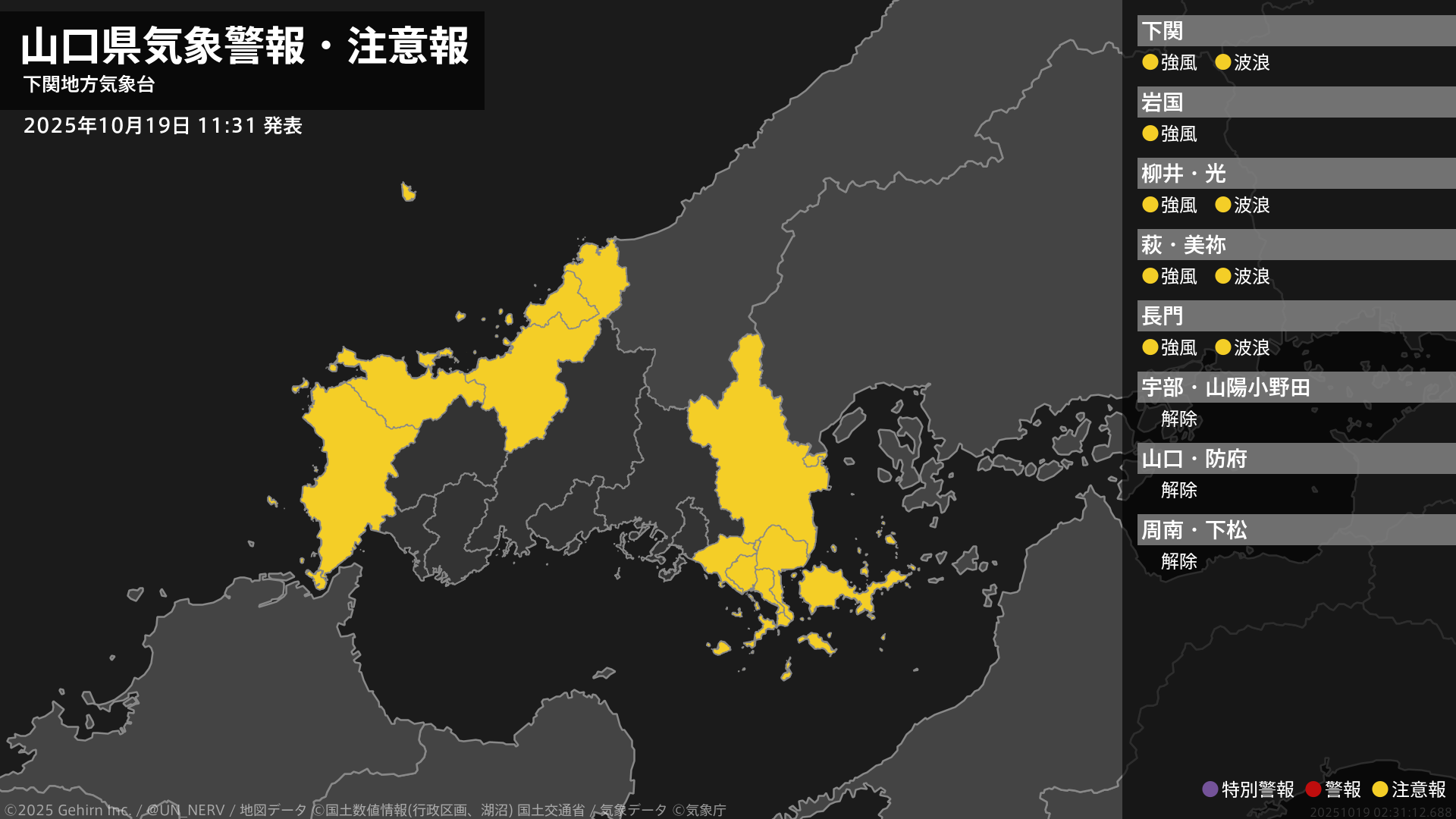 【山口県 気象警報・注意報 2025年10月19日 11:31】