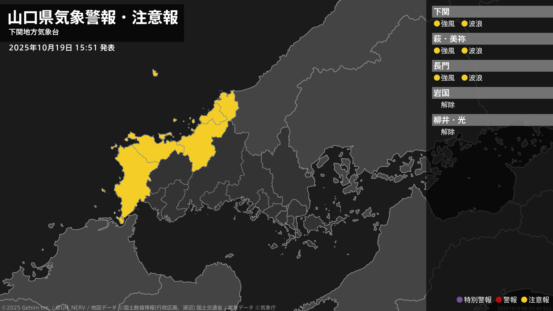【山口県 気象警報・注意報 2025年10月19日 15:51】