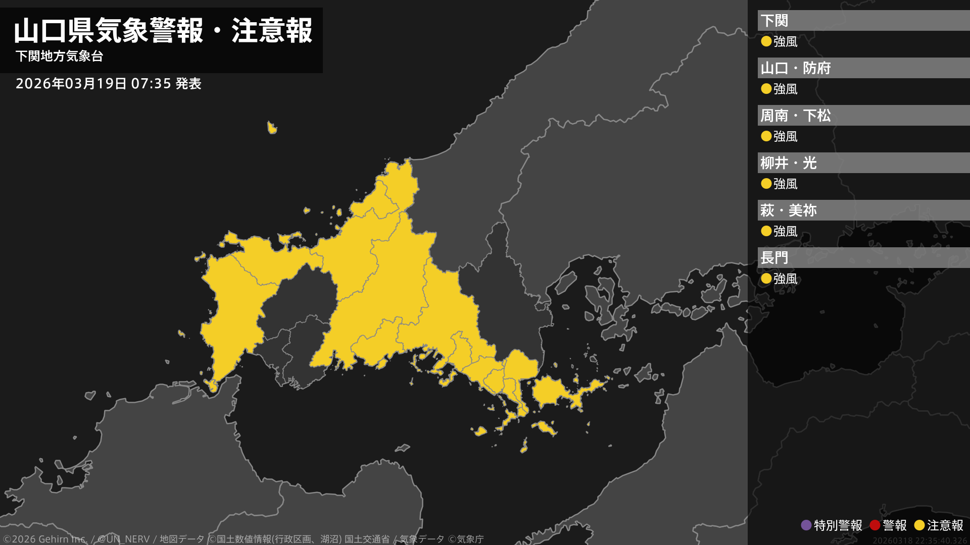 【山口県 気象警報・注意報 2026年03月19日 07:35】西部、北部では19日昼前まで、中部、東部では19日昼過ぎから19日夜遅くまで、強風に注意してください。#気象警報注意報 #山口県