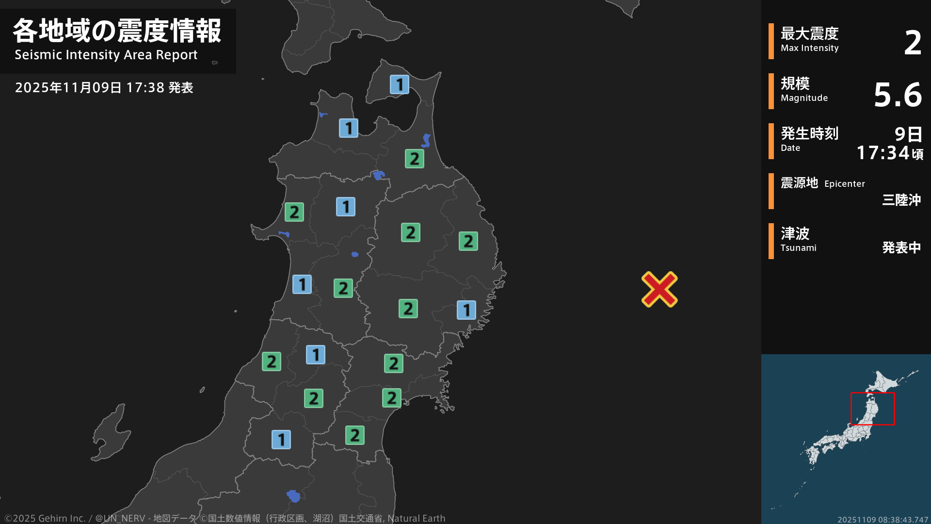 17時34分頃、三陸沖を震源とする地震がありました。震源の深さは約10km、地震の規模はM5.6、最大震度2を青森県、岩手県、宮城県、秋田県、山形県で観測しています。津波注意報を発表中です。