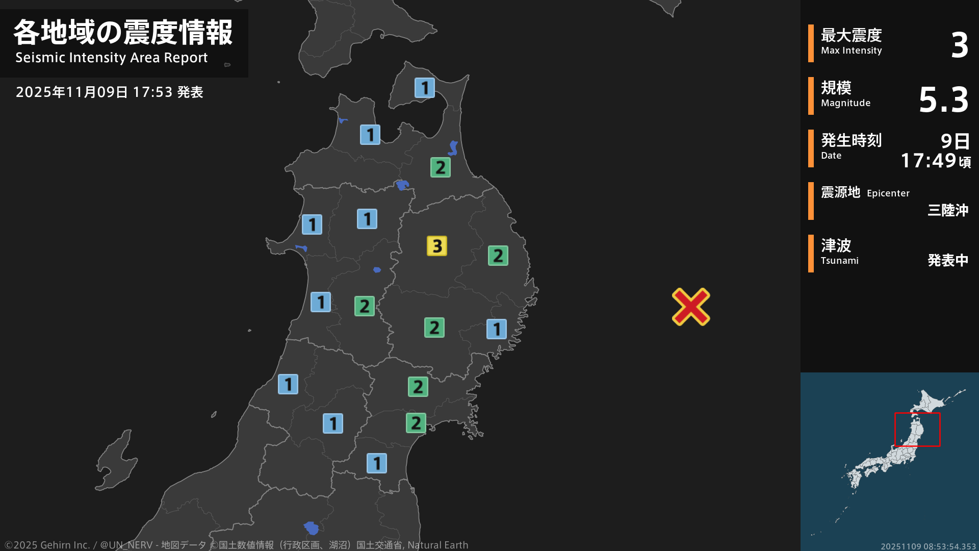 17時49分頃、三陸沖を震源とする地震がありました。震源の深さは約10km、地震の規模はM5.3、最大震度3を岩手県で観測しています。津波注意報を発表中です。