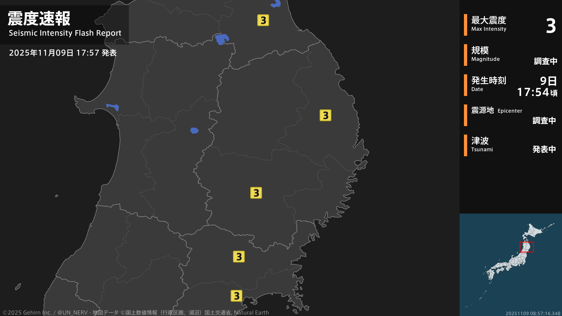 【震度・震源速報 2025年11月9日】
