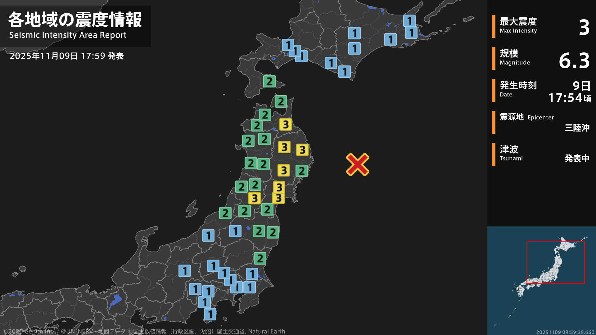 17時54分頃、三陸沖を震源とする地震がありました。震源の深さは約10km、地震の規模はM6.3、最大震度3を青森県、岩手県、宮城県、山形県で観測しています。津波注意報を発表中です。