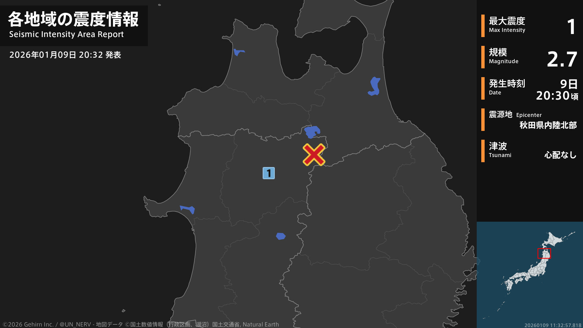 【地震情報 2026年1月9日】20時30分頃、秋田県内陸北部を震源とする地震がありました。震源の深さは約10km、地震の規模はM2.7、最大震度1を秋田県で観測しています。この地震による津波の心配はありません。#地震 #秋田県