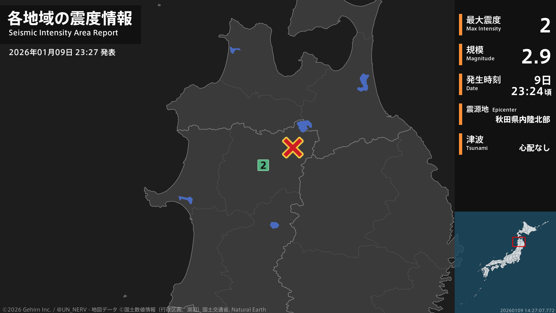 【地震情報 2026年1月9日】23時24分頃、秋田県内陸北部を震源とする地震がありました。震源の深さは約10km、地震の規模はM2.9、最大震度2を秋田県で観測しています。この地震による津波の心配はありません。#地震 #秋田県