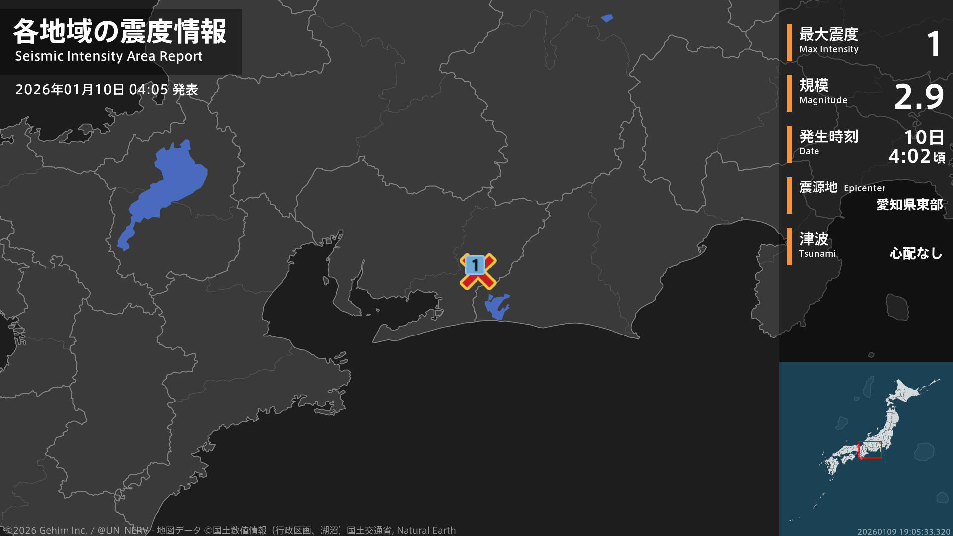 【地震情報 2026年1月10日】4時2分頃、愛知県東部を震源とする地震がありました。震源の深さは約40km、地震の規模はM2.9、最大震度1を愛知県で観測しています。この地震による津波の心配はありません。#地震 #愛知県