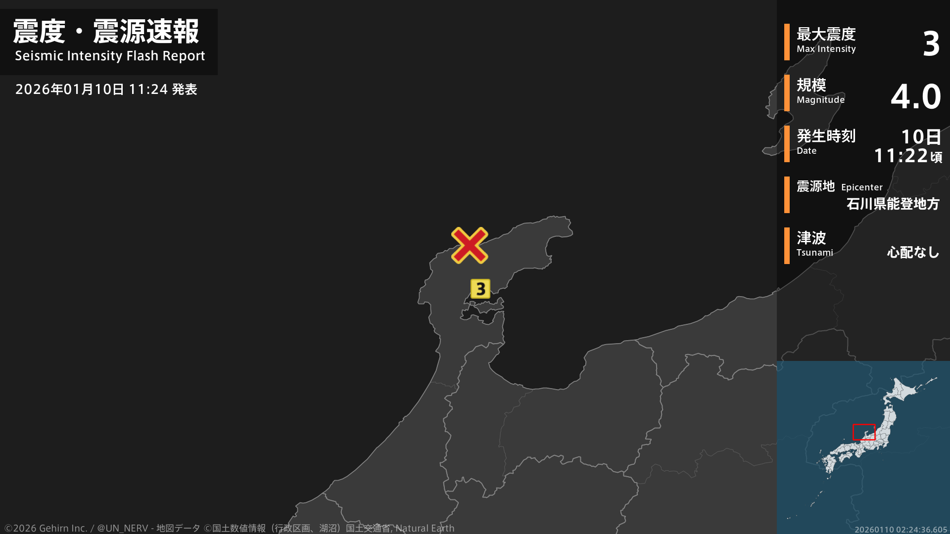 【地震情報 2026年1月10日】11時22分頃、石川県能登地方を震源とする地震がありました。震源の深さは約10km、地震の規模はM4.0、最大震度3を石川県で観測しています。この地震による津波の心配はありません。#地震 #石川県 #富山県