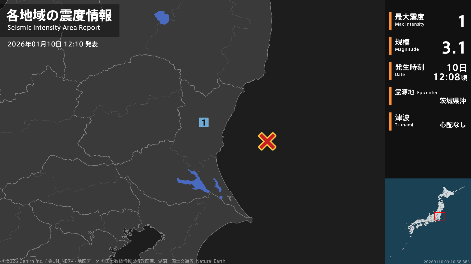 【地震情報 2026年1月10日】12時8分頃、茨城県沖を震源とする地震がありました。震源の深さは約40km、地震の規模はM3.1、最大震度1を茨城県で観測しています。この地震による津波の心配はありません。#地震 #茨城県