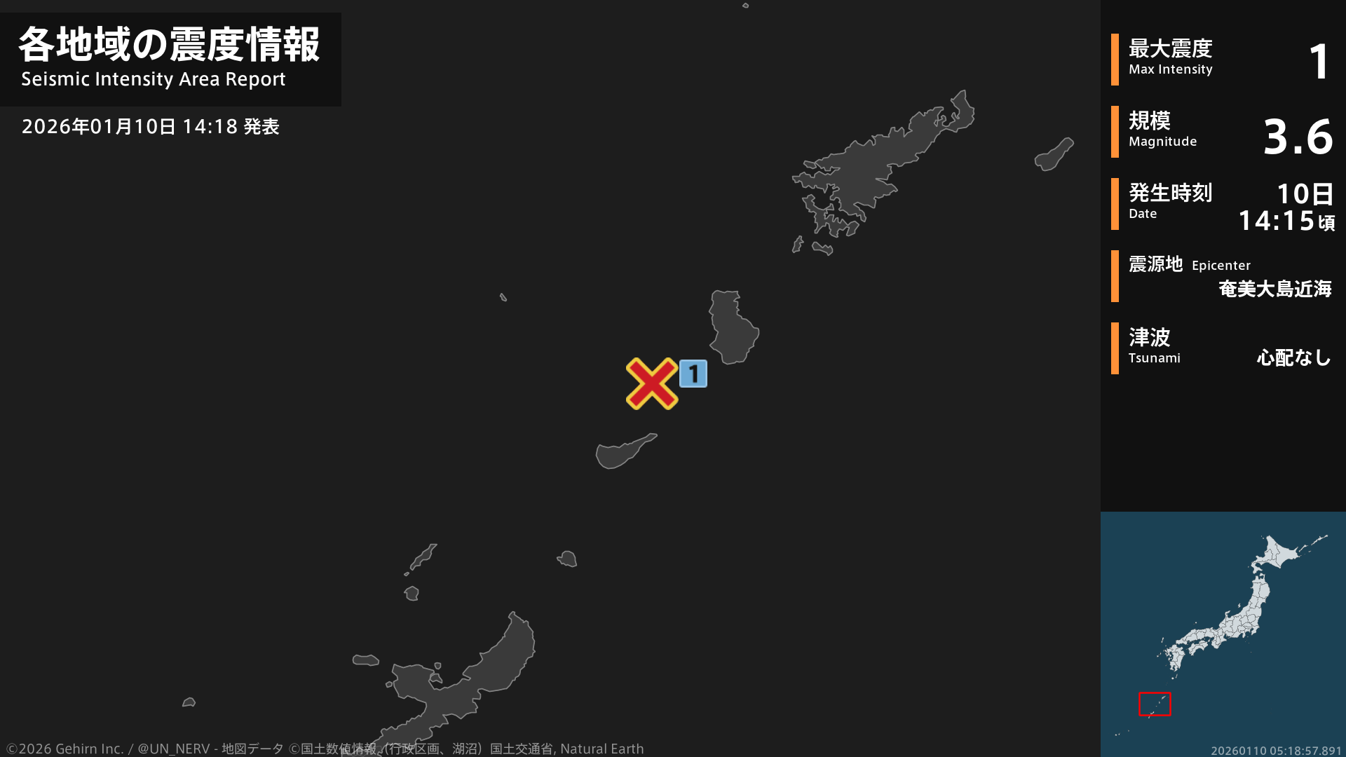 【地震情報 2026年1月10日】14時15分頃、奄美大島近海を震源とする地震がありました。震源の深さは約20km、地震の規模はM3.6、最大震度1を鹿児島県で観測しています。この地震による津波の心配はありません。#地震 #鹿児島県