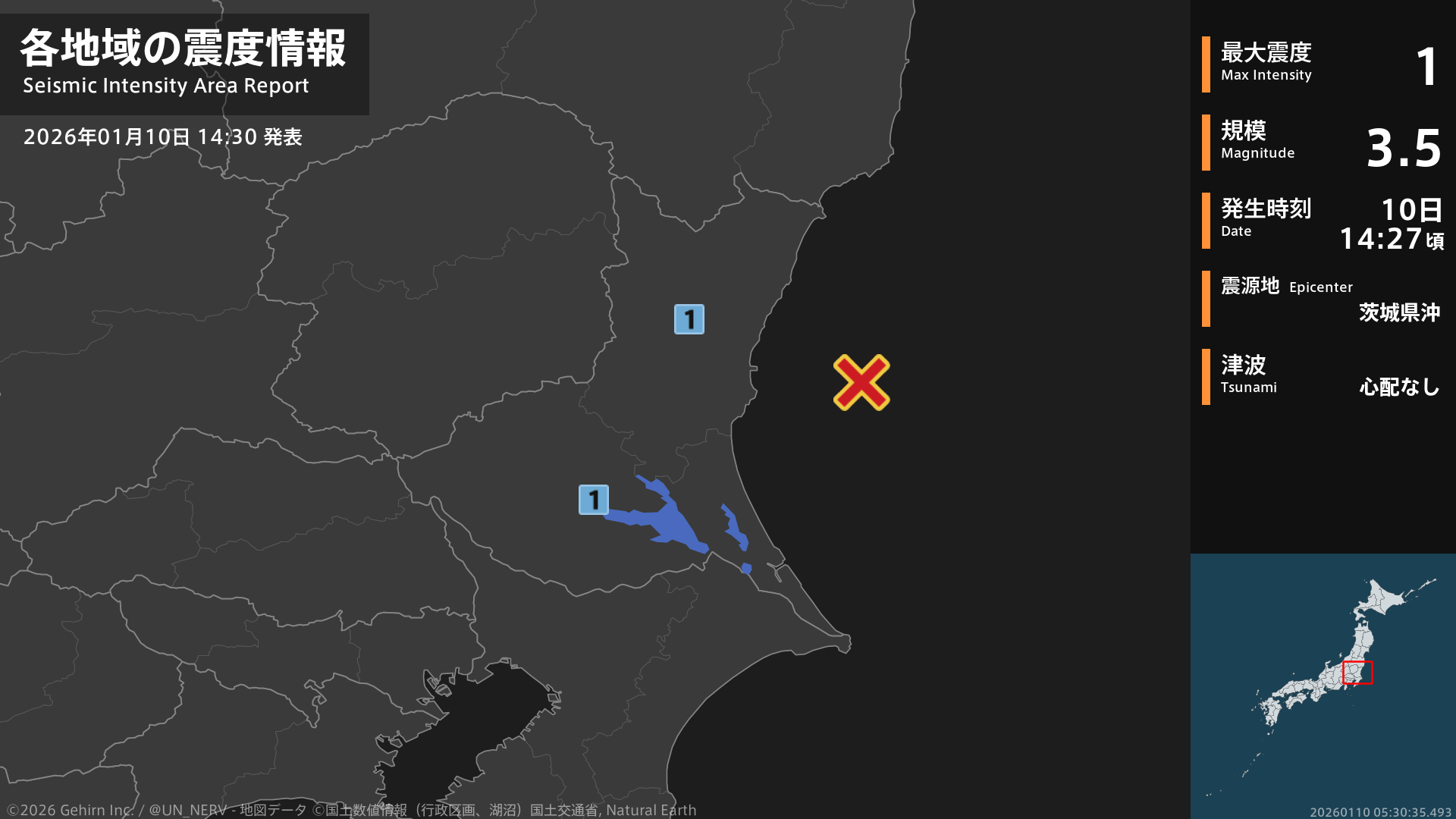 【地震情報 2026年1月10日】14時27分頃、茨城県沖を震源とする地震がありました。震源の深さは約40km、地震の規模はM3.5、最大震度1を茨城県で観測しています。この地震による津波の心配はありません。#地震 #茨城県
