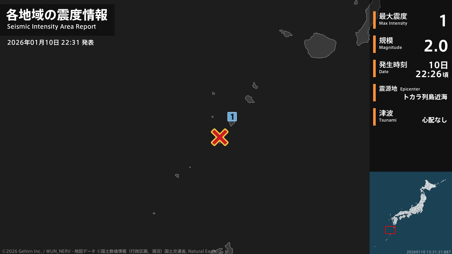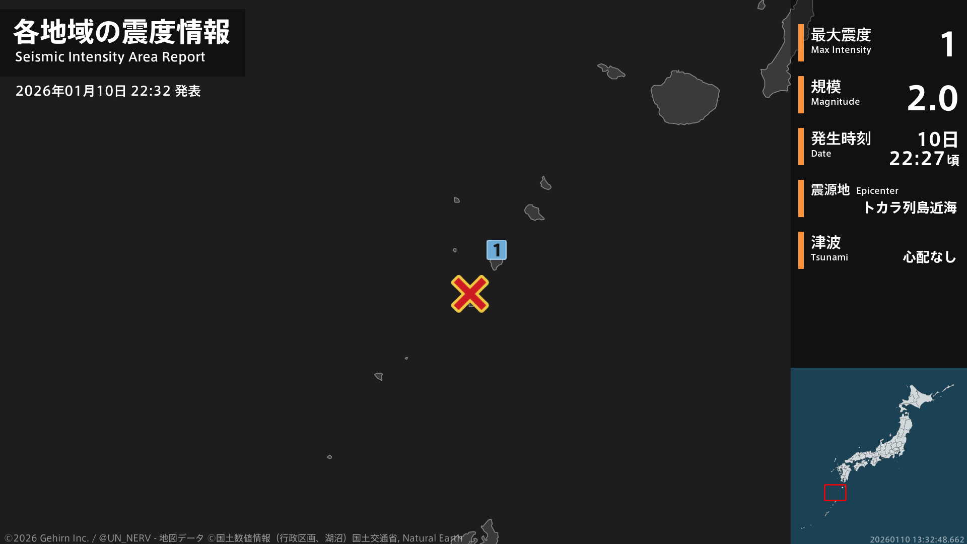 【地震情報 2026年1月10日】22時26分頃、トカラ列島近海を震源とする地震がありました。震源の深さはごく浅い、地震の規模はM2.0、最大震度1を鹿児島県で観測しています。この地震による津波の心配はありません。#地震 #鹿児島県