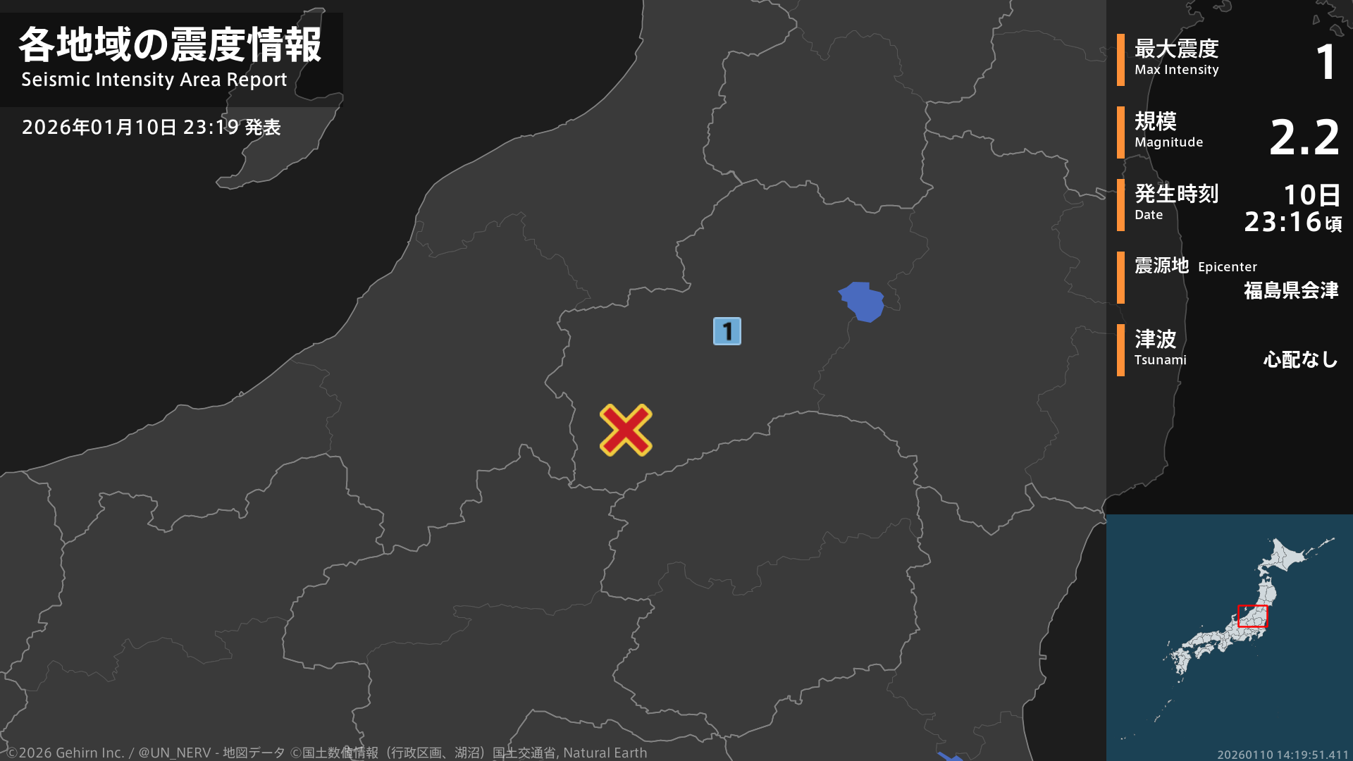 【地震情報 2026年1月10日】23時16分頃、福島県会津を震源とする地震がありました。震源の深さは約10km、地震の規模はM2.2、最大震度1を福島県で観測しています。この地震による津波の心配はありません。#地震 #福島県