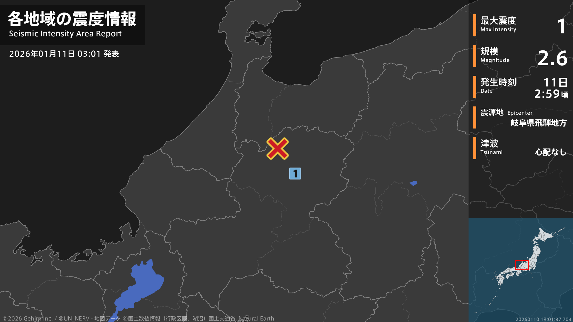 【地震情報 2026年1月11日】2時59分頃、岐阜県飛騨地方を震源とする地震がありました。震源の深さは約10km、地震の規模はM2.6、最大震度1を岐阜県で観測しています。この地震による津波の心配はありません。#地震 #岐阜県