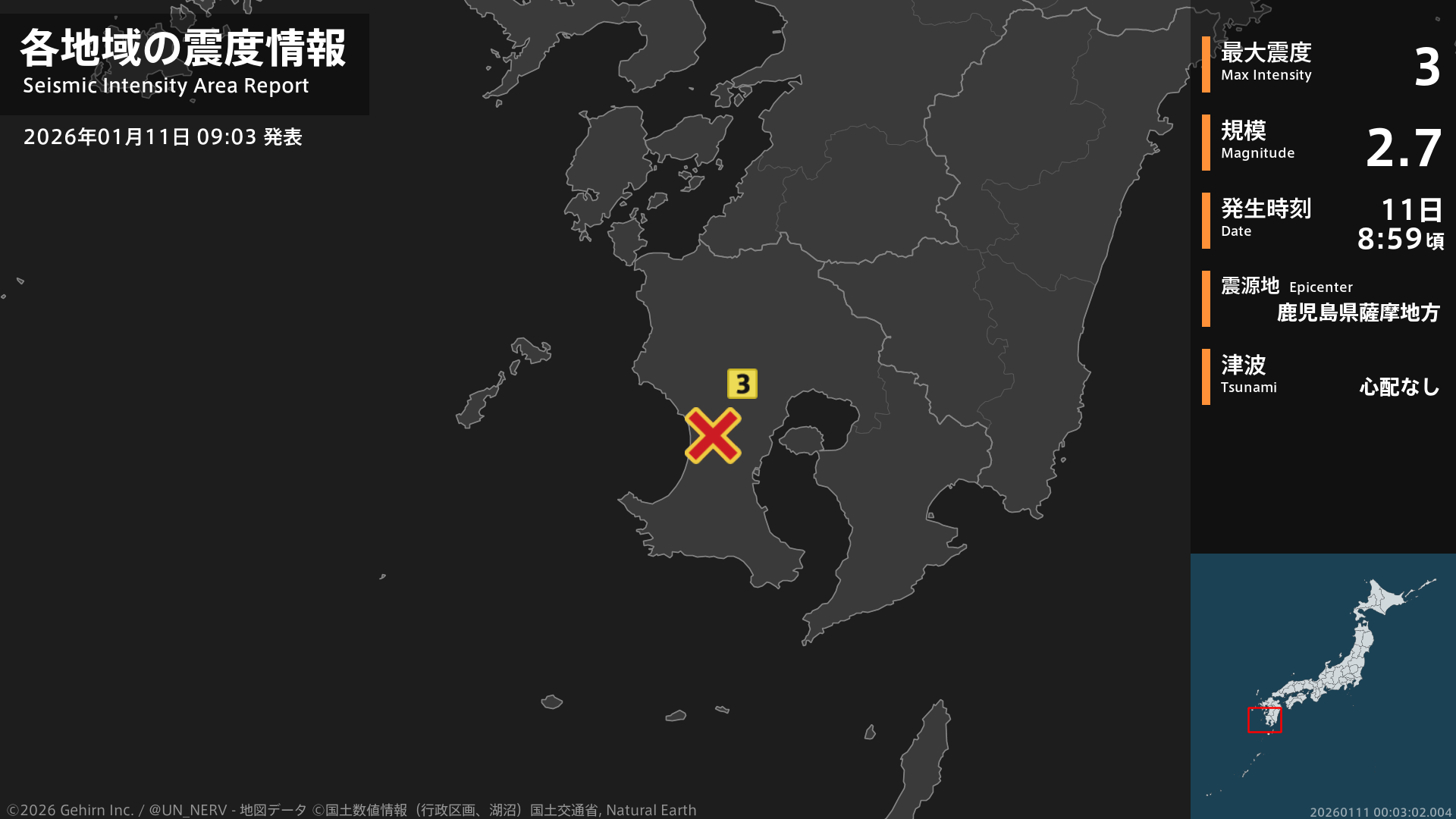 【地震情報 2026年1月11日】8時59分頃、鹿児島県薩摩地方を震源とする地震がありました。震源の深さはごく浅い、地震の規模はM2.7、最大震度3を鹿児島県で観測しています。この地震による津波の心配はありません。#地震 #鹿児島県