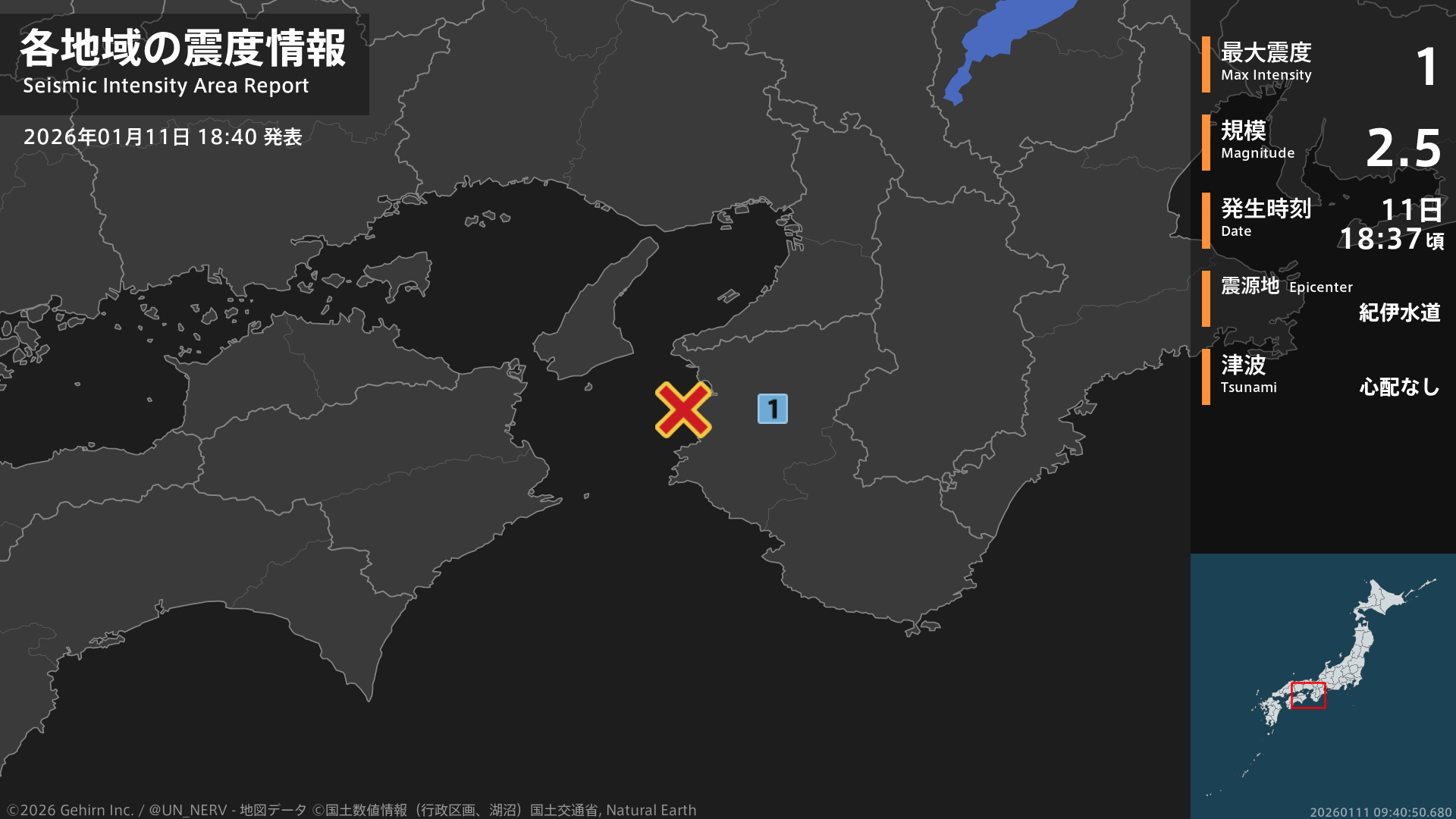 【地震情報 2026年1月11日】18時37分頃、紀伊水道を震源とする地震がありました。震源の深さは約10km、地震の規模はM2.5、最大震度1を和歌山県で観測しています。この地震による津波の心配はありません。#地震 #和歌山県