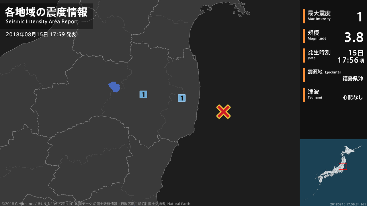 【地震情報 2018年8月15日】17時56分頃、福島県沖を震源とする地震がありました。震源の深さは約20km、地震の規模はM3.8、最大震度1を福島県で観測しています。この地震による津波の心配はありません。#地震 #福島県