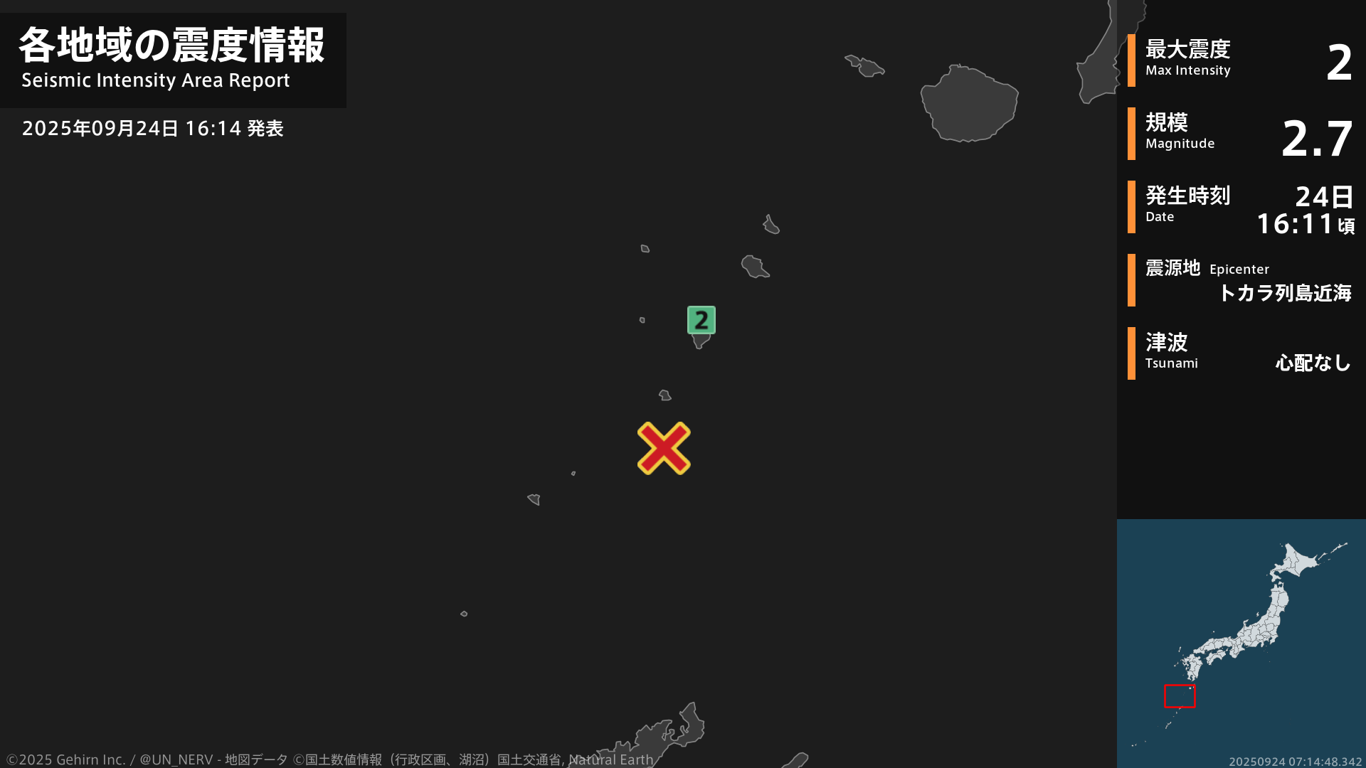 【地震情報 2025年9月24日】16時11分頃、トカラ列島近海を震源とする地震がありました。震源の深さは約20km、地震の規模はM2.7、最大震度2を鹿児島県で観測しています。この地震による津波の心配はありません。#地震 #鹿児島県