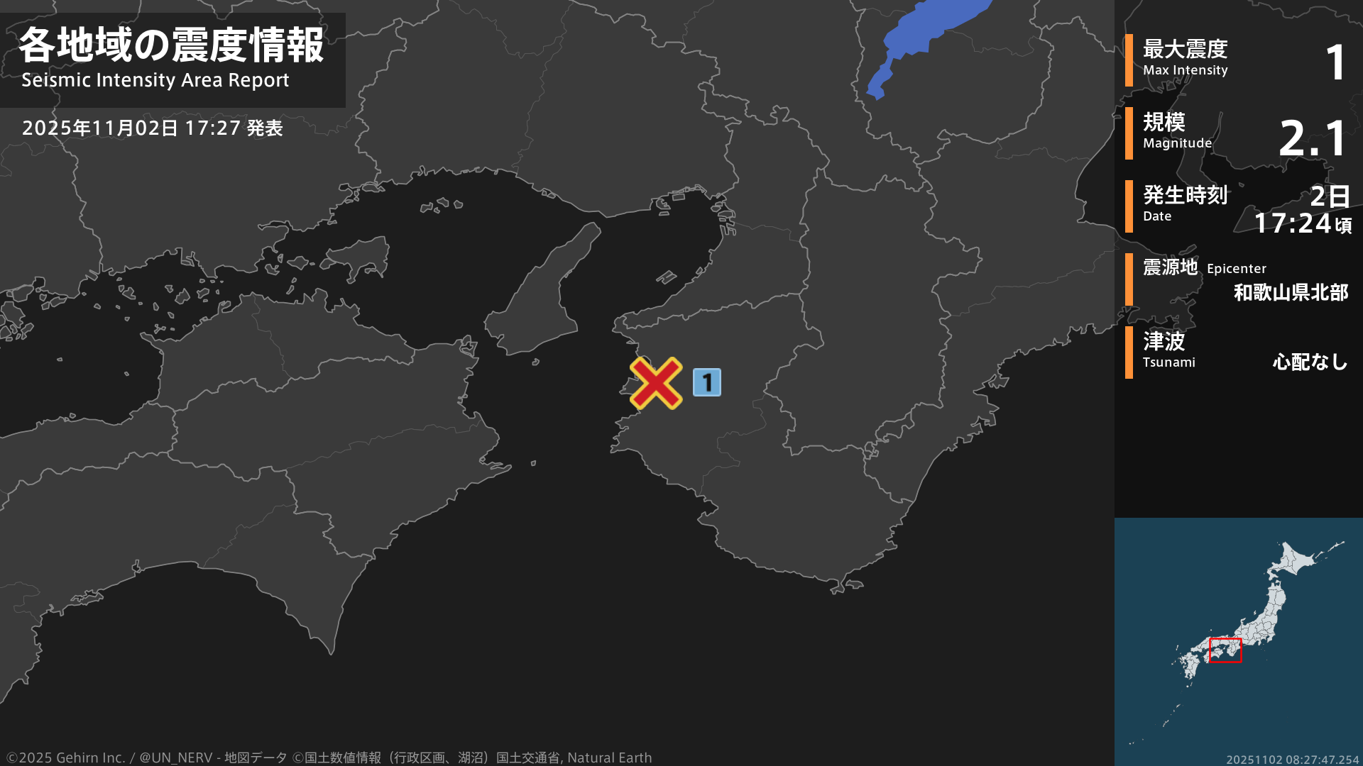 【地震情報 2025年11月2日】17時24分頃、和歌山県北部を震源とする地震がありました。震源の深さはごく浅い、地震の規模はM2.1、最大震度1を和歌山県で観測しています。この地震による津波の心配はありません。#地震 #和歌山県